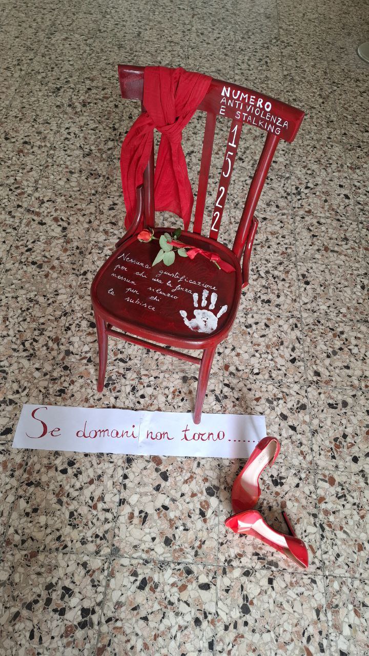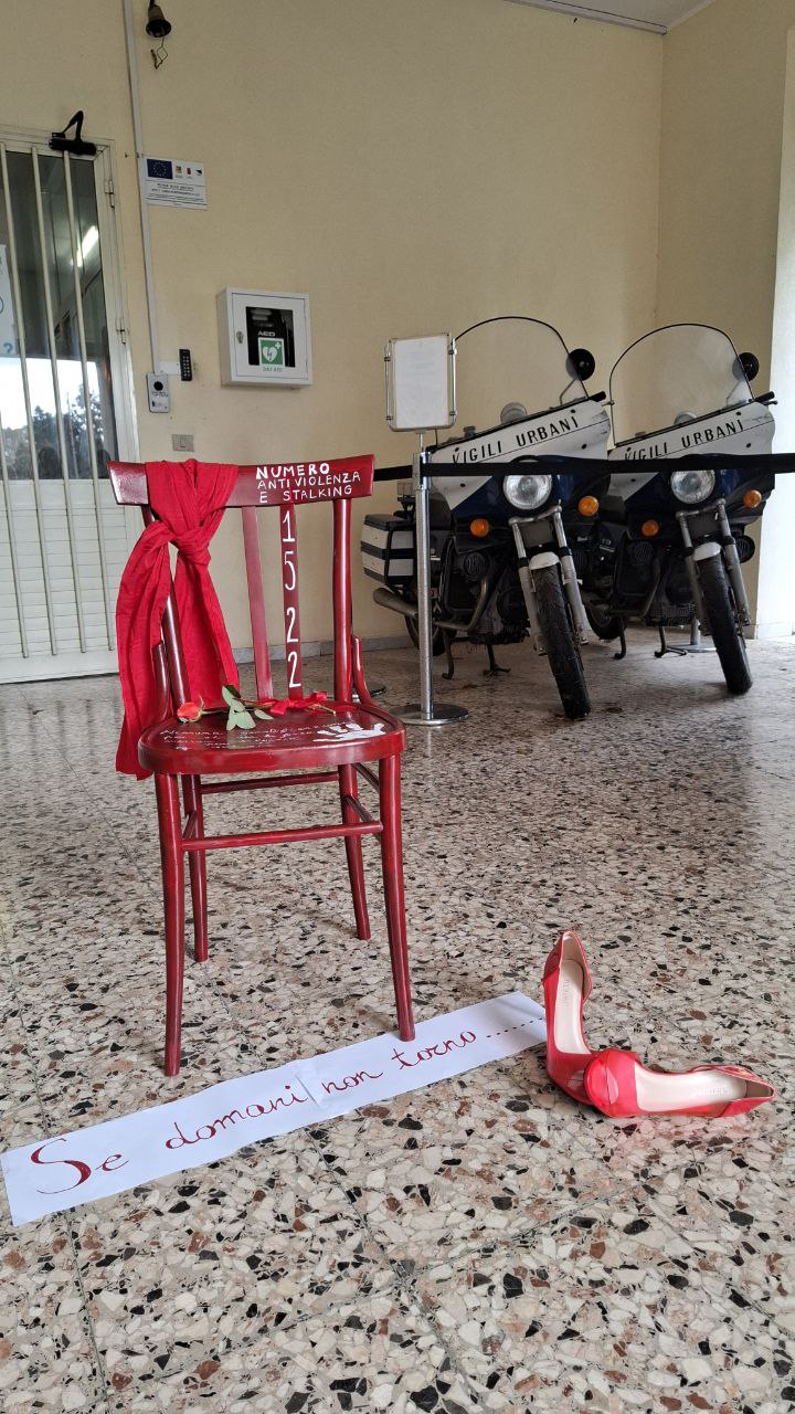 In occasione della Giornata internazionale per l’eliminazione della violenza contro le donne e fino a domenica 30 novembre, davanti le porte della sede degli uffici del Servizio Sociale e della Polizia Municipale di Caltanissetta, in via Alcide De Gasperi 27, è stata collocata un’istallazione con una sedia rossa, una rosa, un paio di scarpe con il tacco e il messaggio: “Se domani non torno…”.