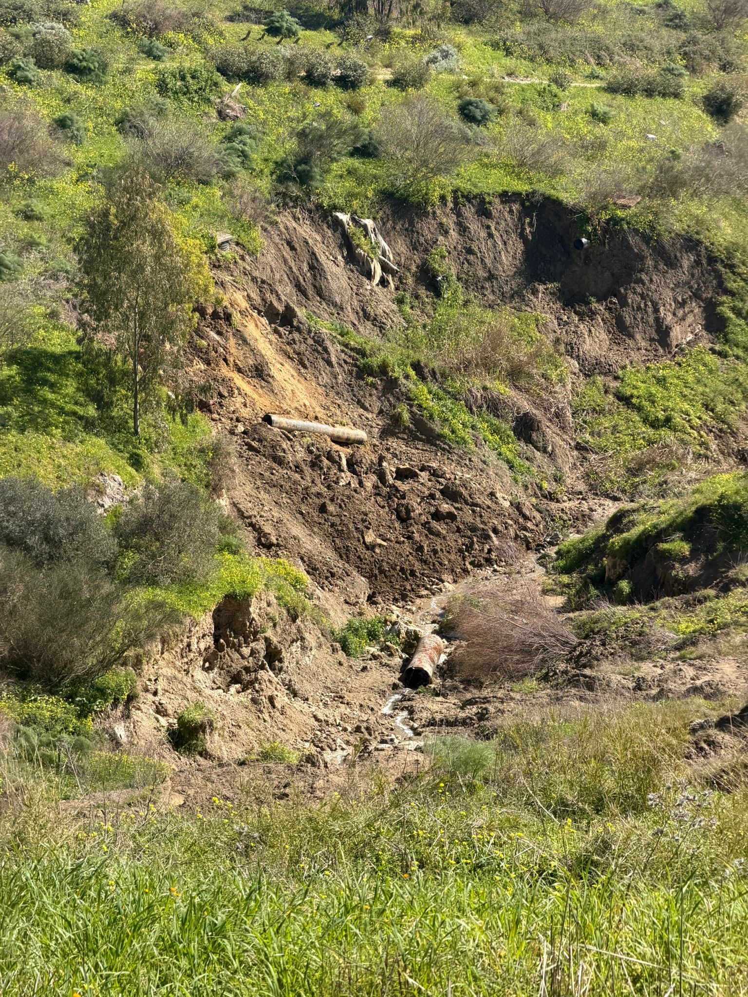 In particolare, lungo la strada in terra battuta che costeggia il versante, è stato rilevato il grave stato di deterioramento della condotta di smaltimento fognario, oltre all’assenza delle necessarie botole di chiusura. Tale situazione potrebbe aver contribuito al cedimento strutturale della pavimentazione in calcestruzzo della strada, interrotta a valle da fenomeni franosi.