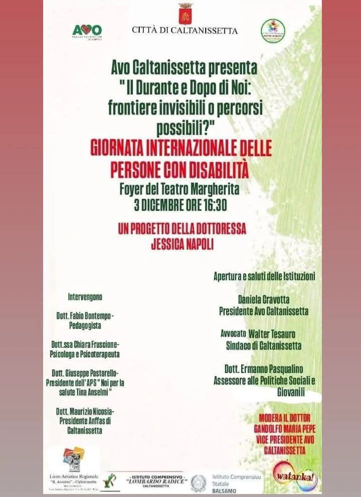 Domande cruciali, spesso rimaste ai margini del dibattito pubblico, saranno al centro della conferenza “Il Durante e Dopo di Noi: frontiere invisibili o percorsi possibili?”, organizzata dall’AVO Caltanissetta in occasione della Giornata Internazionale delle Persone con Disabilità.