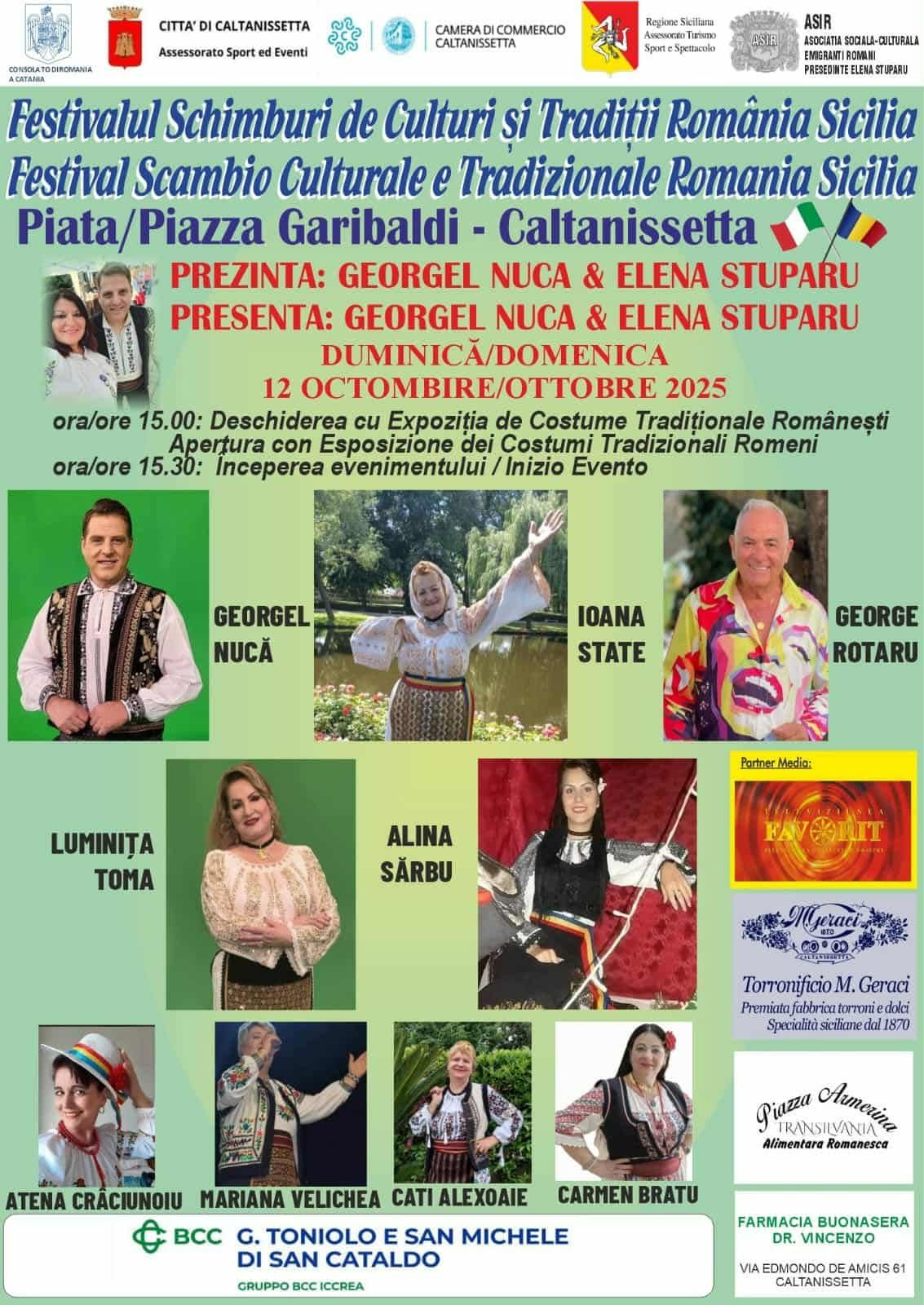 Caltanissetta domenica 12 Ottobre 2025 dalle 15.30 e fino a notte inoltrata accoglierà il Festival di Scambio Culturale e Tradizionale Romania – Sicilia organizzato dall'ASSIR, Associazione socio culturale Immigrati Rumeni, e dalla sua presidentessa Elena Stuparu.