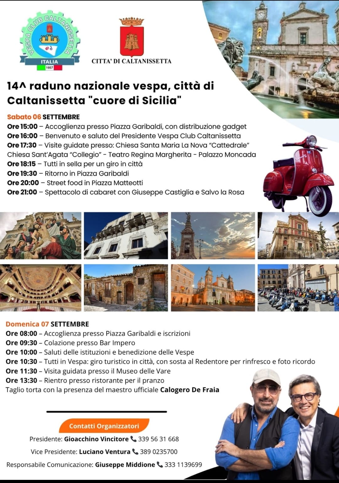 Sabato 6 e domenica 7 settembre si terrà il 14° raduno nazionale denominato "Città di Caltanissetta, Cuore di Sicilia" di una delle due ruote storiche del nostro Paese come l'intramontabile Vespa.