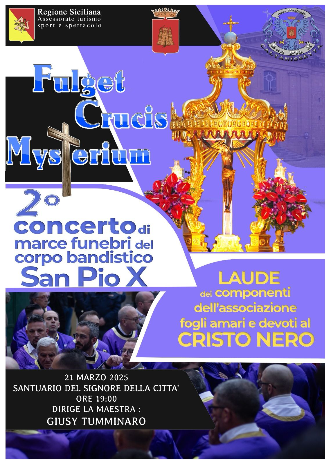 Fulget Crucis Myserium, Concerto di Marce funebri del corpo bandistico San Pio X diretto dalla maestra Giusy Tumminaro con Laude dei componenti dell’associazione Fogliamari e devoti al Cristo Nero per il Santuario Signore della città