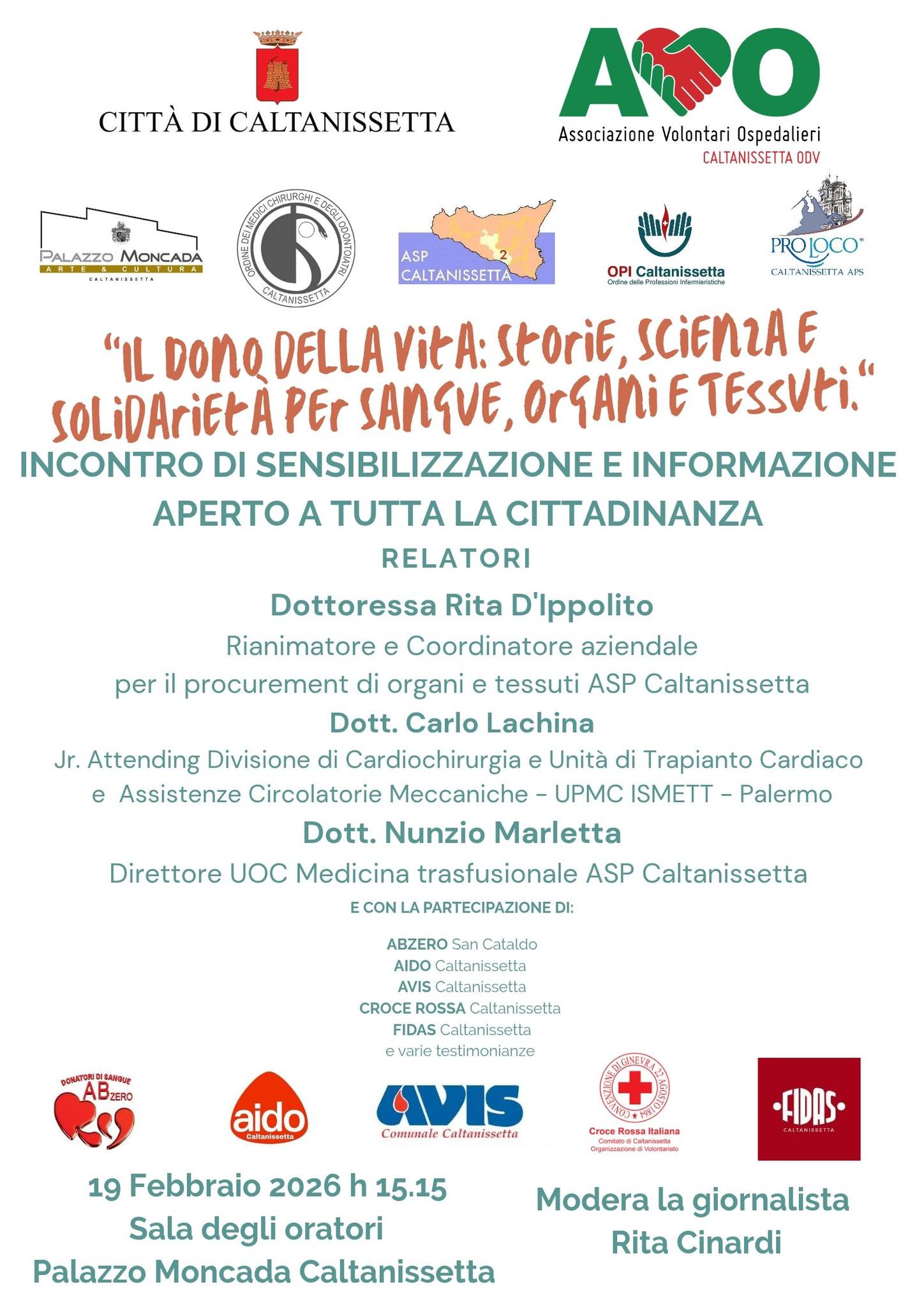Moderati dalla giornalista Rita Cinardi interveranno la Dottoressa Rita D’Ippolito (ASP Caltanissetta), il Dottor Carlo Lachina (UPMC ISMETT - Palermo) e il Dottor Nunzio Marletta (ASP Caltanissetta)