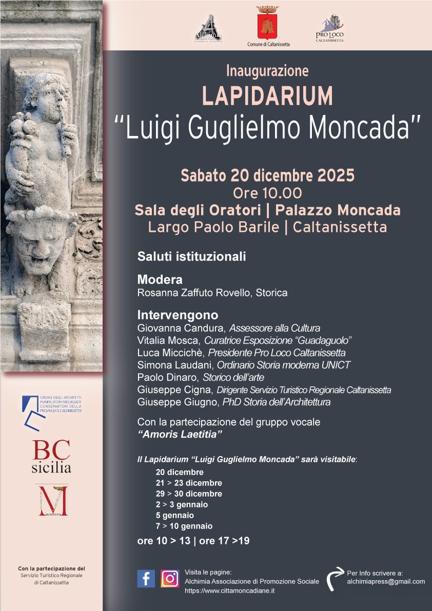 Dal 20 dicembre 2025 sarà aperto al pubblico lo spazio espositivo "Lapidarium Luigi Guglielmo Moncada", un nuovo e prestigioso spazio museale situato all’interno di Palazzo Moncada.